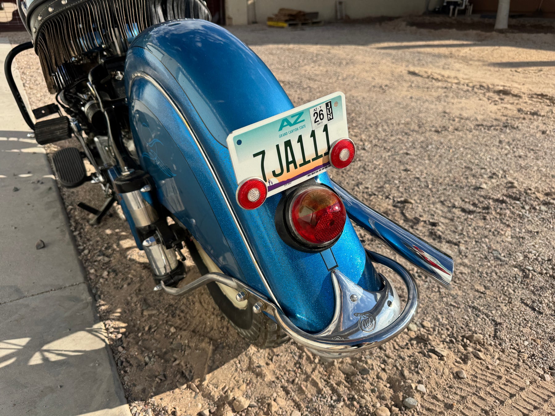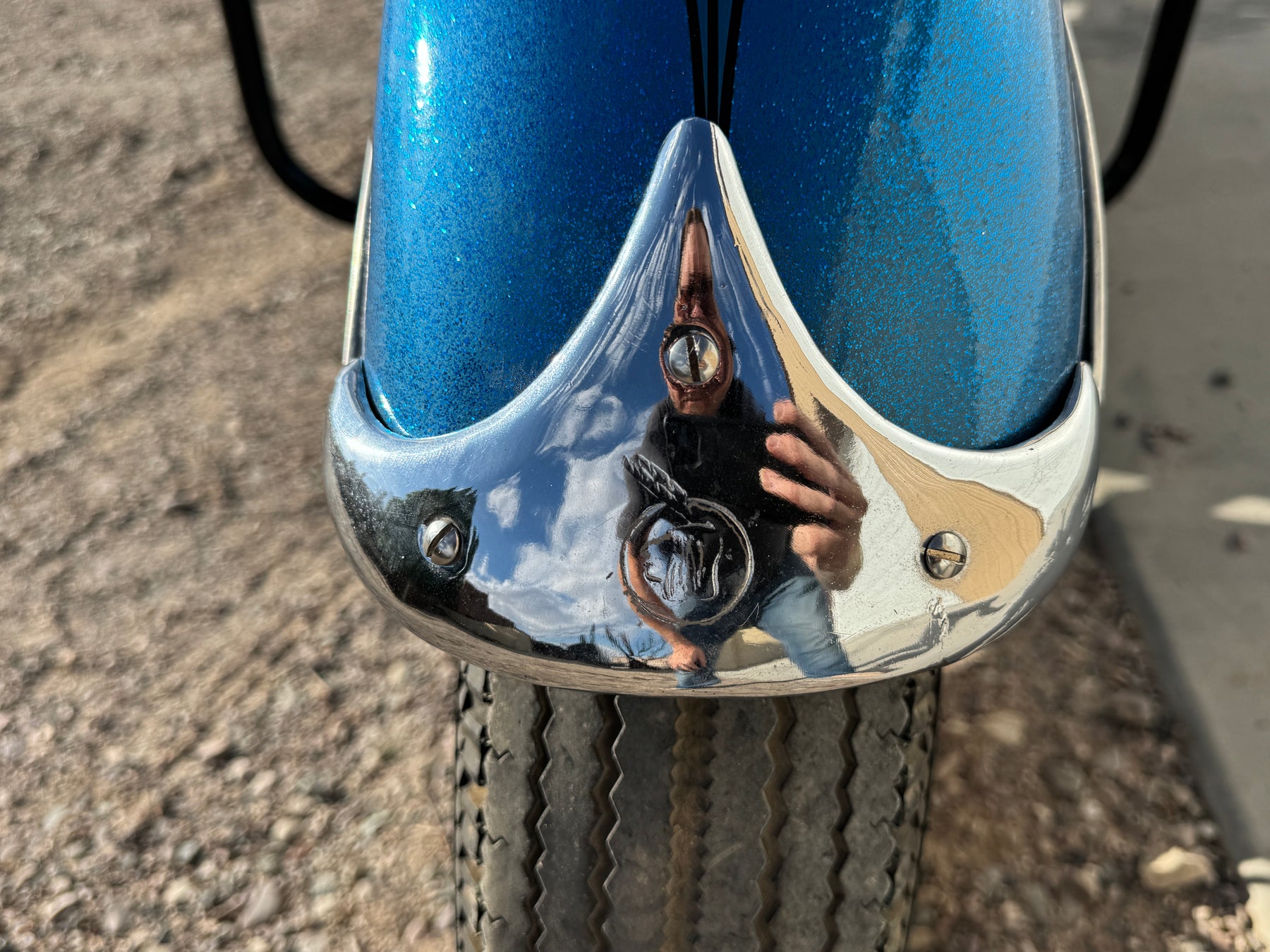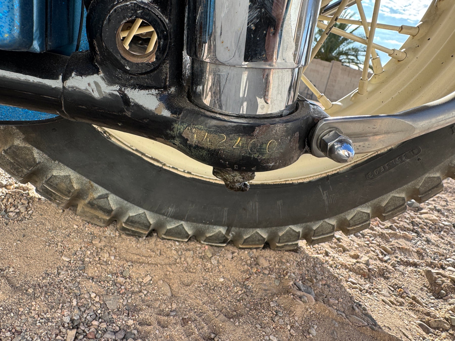 This motorcycle im guessing by the paint was probably done sometime back in the 70's? Features heavy Metallic Paint Flake and old school pinstriping. There is some Paint Flakes, Chips, and Scrapes. No Major rust or pitting.