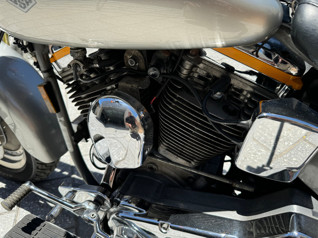 The 1990 Harley-Davidson Fat Boy's power came from a 1,337cc four-stroke V-twin air-cooled engine, fed by a Keihin carburetor, boasting 67 hp with a peak force at 6,000 rpm and 97 Nm (72 lb-ft) torque at 2,350 rpm.